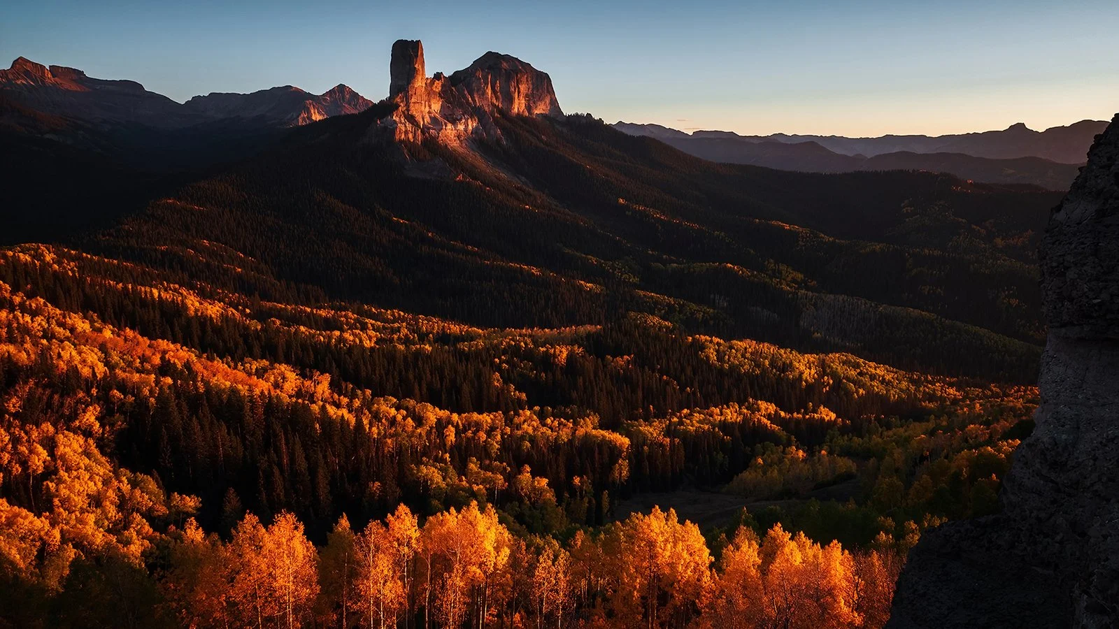 Down the road, the highway climbs into a series of hairpin turns near the famous Red Mountain Pass. Although reportedly treacherous in rain or winter conditions, the pass is eminently driveable on this calm, breezy (and yet again totally cloudless) autumn day. Near the top of the hairpins, I stop for a look back down the valley, and some lovely shots of morning light breaking over the wall of the mountains to the east. Then, it’s further south to the other end of the pass, where the road descends into another valley as it makes its way toward Silverton. I decide not to stop in Silverton, continuing onward to Molas Pass, where I stop at a few overlooks to photograph the forest, the mountains, and a distant cabin on a plateau, which acts as an object of interest.